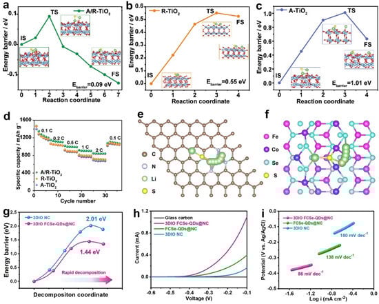 Oxides have been investigated to catalyze the electrochemical conversion of Li-S batteries [80]. TiO2 has been confirmed to have favorable chemical adsorption for anchoring polysulfides. However, it is plagued by intrinsically low conductivity, impeding the conversion kinetics of sulfur cathodes. Wei and co-workers developed a high-performance TiO2 catalyst composed of a rich O-vacancy TiO2 anatase/rutile homojunction on carbon nanosheets (A/R-TiO2) [45]. The heterointerface of A/R-TiO2 provided effective anchoring and smooth conversion of polysulfides. It also significantly reduced the Li2S decomposition energy barrier. Figure 11a–c show the calculated Li2S decomposition energy barriers of A/R-TiO2, R-TiO2, and A-TiO2. A/R-TiO2 revealed a lower decomposition barrier of 0.09 eV compared to R-TiO2 (0.55 eV) and A-TiO2 (1.01 eV), suggesting the accelerated delithiation kinetics of Li2S. Jiang et al. determined the crystal facet effects of Fe2O3 on the catalytic conversion of Li-S batteries [102]. The authors developed reduced graphene oxide to load high-index faceted Fe2O3 nanocrystals, which bifunctionally catalyzed sulfur cathodes. The (1238) and (1344) facets of Fe2O3 considerably decreased the Li2S decomposition energy barriers in contrast to the Fe2O3 (0112) facet. This conclusion indicated that high-index facets possessed higher catalytic activities to split the S-Li bond, promoting the Li2S dissociation kinetics. As a result, sulfur cathodes with A/R-TiO2 achieved favorable capacities at various current densities (Figure 11d).