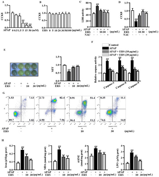 ERS ameliorated APAP-provoked apoptosis and ferroptosis in AML-12 hepatocytes. (A,B) AML-12 hepatocytes were treated with the indicated concentrations of APAP (A) or ERS (B) for 24 h, and then subjected to CCK8 assay. (C,D) AML-12 hepatocytes were incubated with ERS (10 and 30 μg/mL) or NAC (10 mM) for 24 h. Then, cells were treated with 5 mM APAP for another 24 h. Finally, cytotoxicity was determined by LDH (C) and CCK8 (D) assay. (E–H) AML-12 cells were incubated with ERS (10 and 30 μg/mL) for 24 h and treated with 5 mM APAP for another 24 h. Then, cell viability was determined by MTT assay (E). Both MTT staining results (left) and statistical results (right) were shown. Cell apoptosis was detected by caspase activity assay (F) and FACS (G). Cell ferroptosis was detected by measuring related parameters such as iron, MDA, 4-HEN, and LPO (H). # p < 0.05, ## p < 0.01, compared to cells treated by vehicle. * p < 0.05, ** p < 0.01, compared to cells treated by APAP alone.