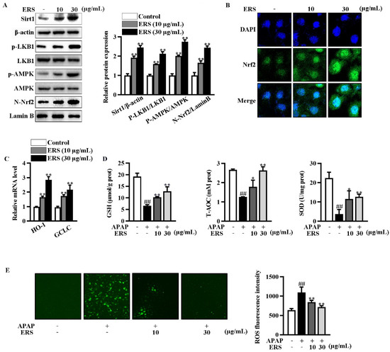 ERS elevated Sirt1 expression and activated the LKB1/AMPK/Nrf2 axis in AML-12 cells. (A–C) AML-12 hepatocytes were incubated with the indicated concentrations of ERS for 24 h. Then, protein levels of intracellular Sirt1, phosphorylation of LKB1 and AMPK, and Nrf2 in nuclei were detected by immunoblotting (A). Both immunoblotting images (left) and statistical results (right) were shown. Nuclear accumulation of Nrf2 was also detected by confocal microscope. (B). Transcriptions of HO-1 and GCLC were detected by real-time PCR (C). (D,E) AML-12 cells were incubated with ERS (10 and 30 μg/mL) for 24 h, and challenged with APAP (5 mM) for another 24 h. Then, intracellular antioxidative parameters including GSH, T-AOC, and SOD were determined (D). ROS were determined by fluorescence staining (E, left) and fluorescence spectrophotometry assay (E, right). ##: p < 0.01, compared to cells treated by vehicle (D,E). * p < 0.05, ** p < 0.01, compared to cells treated by vehicle (A,C) or APAP alone (D,E).