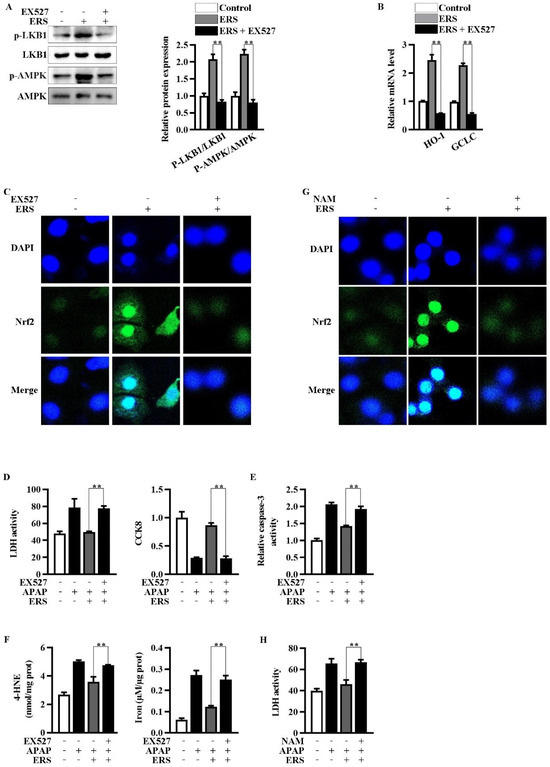 Inhibition of Sirt1 by EX527 resulted in an abrogation of ERS-mediated activation of LKB1/AMPK (Figure 4A). Upregulations of Nrf2 in nuclei and transcription of HO-1 and GCLC were, in turn, eliminated by EX527 (Figure 4B,C). NAM is another Sirt1 inhibitor whose chemical structure is unrelated to that of EX527. NAM also antagonized the nuclear translocation of Nrf2 induced by ERS (Figure 4G). Additionally, both EX527 and NAM reversed the protective effects of ERS on APAP-provoked cytotoxicity in AML-12 hepatocytes (Figure 4D–F,H). The aforementioned results indicated critical involvement of Sirt1 in the hepatoprotective activity of ERS.