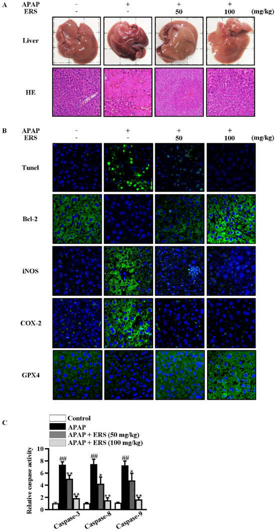ERS reduced APAP-provoked liver injury in mice. (A–C) Mice were treated as indicated. Appearances of livers of mice were shown, and liver sections were prepared and subjected to HE staining (A). Apoptotic cells in livers were visualized by TUNEL. Hepatic levels of Bcl-2, iNOS, COX-2, and GPX4 were determined by immunohistochemistry staining (B). Activities of caspase-3, -8, and -9 in livers were also quantified (C). ##: p < 0.01, compared to the normal mice. * p < 0.05, ** p < 0.01, compared with the mice receiving APAP alone.
