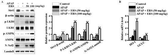 ERS modulated Sirt1/LKB1/AMPK/Nrf2 cascade in mouse livers. (A,B) Mice were treated as indicated. Hepatic levels of Sirt1 and phosphorylated LKB1 and AMPK in total lysates and Nrf2 in nuclei were detected by immunoblotting (A). Transcriptions of HO-1 and GCLC were detected by real-time PCR (B). ##: p < 0.01, compared to the normal group. * p < 0.05, ** p < 0.01, compared to the mice receiving APAP alone.