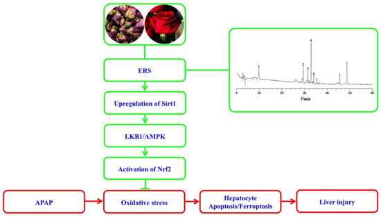 Rose (Rosa rugosa) constitutes a commonly used herbal medicine with a wide range of biological activities, especially in its dried flower buds. It boosts expressions of antioxidant enzymes and inhibits lipid peroxidation in livers [36]. It also improves hepatic lipid metabolism via modulating AMPK [37]. However, it is currently unclear whether rose has the capacity to alleviate APAP-induced liver injury and modulate hepatic Nrf2 signaling. Thus, we prepared an ethanol extract of Rosa rugosa (ERS), analyzed its characteristic chemical components, evaluated the protective effects of ERS on APAP-induced liver injury in mice, and explored the underlying molecular mechanisms.