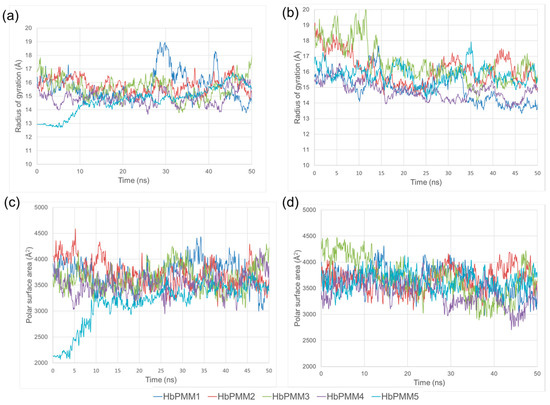 Macroscopic properties for five HbPMM species of R14 and R17 calculated over 50 ns MD simulation at 300 K using Desmond software version 2022.4 and OPLS-2005 force field: the radius gyration is shown in panels (a) R14 and (b) R17, while the polar surface area is shown in panels (c) R14 and (d) R17.