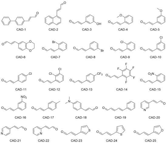 - Preparation of (E)-3-(2-chlorophenyl)acrylaldehyde (CAD-9) [23]: Under an argon atmosphere, 2-chlorobenzaldehyde (140 mg, 1 mmol) was dissolved in 3 mL tetrahydrofuran in an ice bath; 40% acetaldehyde aqueous solution (170 μL, 1.2 mmol) and 1 mL 1 mol/L NaOH aqueous solution were added to react for 3 h. The crude products were purified via column chromatography (dichloromethane: methanol = 10:1). The product compound 9 was obtained as a pale yellow oil, 135 mg, with a yield of 81.4%. 1H NMR (400 MHz, CDCl3) δ 9.79 (d, J = 7.6 Hz, 1H), 8.12 (dd, J = 8.1, 1.2 Hz, 1H), 8.05 (d, J = 15.9 Hz, 1H), 7.77–7.67 (m, 2H), 7.62 (ddd, J = 8.6, 6.8, 2.0 Hz, 1H), 6.64 (dd, J = 15.9, 7.6 Hz, 1H). 13C NMR (100 MHz, Chloroform-d) δ 193.13, 147.30, 133.83, 132.67, 131.16, 130.04, 129.09, 125.24. MS (EI) m/z: 166, found 166.
