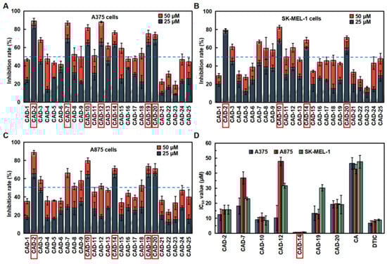 Effect of CA analogues in melanoma cells. (A–D) The different melanoma cell lines were treated with 0–50 µM analogues for 72 h, and then IC50 value was assayed (A dashed blue line: 50% inhibition rate; red box: analogues with high activity).