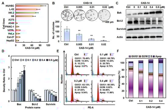 To evaluate the specificity of CAD-14 towards various cell types, multiple types of cancer cells and normal cells were tested. CAD-14 inhibited A375 cells more effectively than other cancer cells and was less sensitive to normal cell lines (Figure 3A). A375 cells were chosen for the follow-up experiments. A colony-forming assay was used to establish that CAD-14 exhibits proliferation inhibitory activity. Compared to the “Ctrl” group, CAD-14 significantly reduced the number of colonies (Figure 3B). To determine whether the cytotoxic effect of CAD-14 was associated with apoptosis, we tested the apoptosis-related protein via Western blotting. As depicted in Figure 3C,D and Supplement Figure S1, the expression of the pro-apoptotic protein Bak was strongly increased, while the expression of the anti-apoptotic proteins Bcl-2 and survivin was substantially diminished after treatment with CAD-14 in a dose-dependent manner. In order to investigate whether cell cycle arrest contributed to CAD-14-induced cell growth inhibition, the cell cycle distribution was analyzed using a flow cytometer. As displayed in Figure 3E,F, CAD-14 markedly induced S phase arrest in A375 cells in a concentration-dependent manner. These findings suggest that CAD-14 might substantially inhibit the proliferation of A375 cells and arrest the S phase.