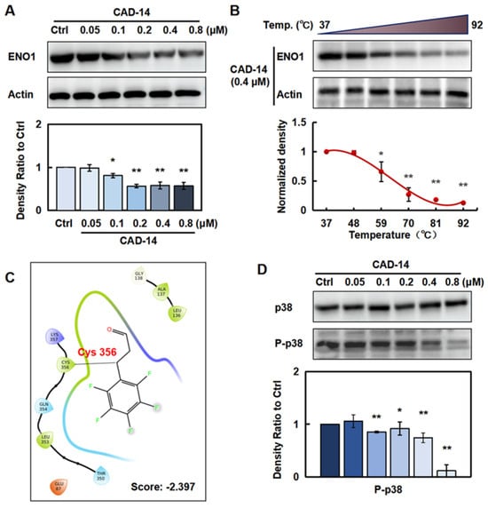 Validation of the CAD-14 anti-melanoma pathway. (A) Cells were treated with 0–0.8 µM CAD-14 for 24 h, and the ENO1 was assayed via Western blotting. (B) CAD-14 treatment (0.4 μM) decreased the thermal stability of ENO1 in cell lysates, as measured using a temperature-dependent CETSA. (C) Molecular docking analysis of ENO1 and CAD-14. (D) Cells were treated with 0–0.8 µM CAD-14 for 24 h, and the p-38/P-p38 were assayed via Western blot. Histograms show the intensity ratio. Values represent the means ± SD. * p < 0.05, ** p < 0.01 versus “Ctrl” group.