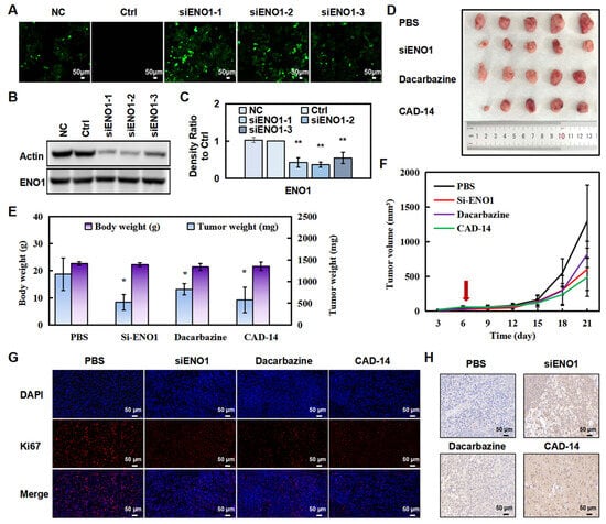 CAD-14 inhibited the growth of A375 cells in vivo. (A–C) The A375 cells were transfected with three different recombinant ENO1 retroviral vectors and an NC virus for 72 h; the effect of recombinant retrovirus on ENO1 expression were evaluated via fluorescence photography and Western blotting. Histograms show the intensity ratio. (n = 3). Values represent the means ± SD. ** p < 0.01 versus “NC” group. (D–F) Cells were injected subcutaneously into nude mice. Then, they were treated with Dacarbazine (10 mg/kg/day, as a positive control) or CAD-14 (5 mg/kg/day) for two weeks (the red arrow at day 7 represents the first day of treatment). The tumor volume was calculated (n = 5). (G,H) Immunofluorescent staining of Ki67 and ENO1 to detect proliferation ability and expression of ENO1 in tumor tissues, respectively. Values represent the means ± SD. * p < 0.05 versus “PBS” group.