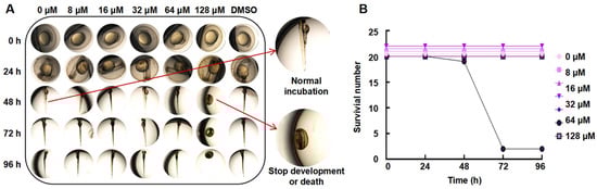 Developmental effects of CAD-14 on embryos. (A) The embryo morphology after CAD-14 treatment for 0–96 h. (B) Survival statistics in different time and concentration.