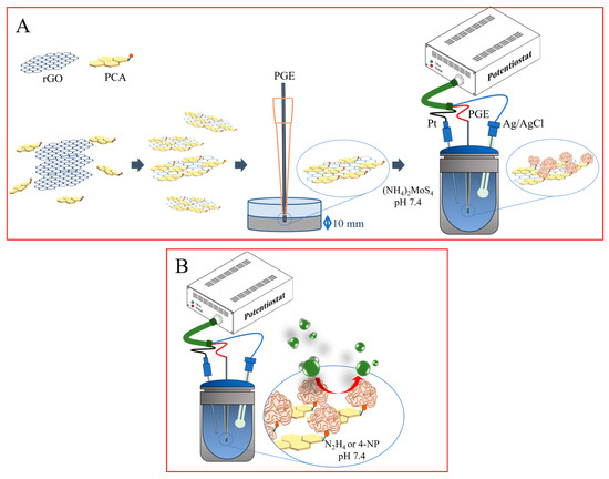 Scheme of (A) exfoliation and functionalization of rGO with PCA, deposition of rGO onto PGEs and electrochemical deposition of MoS2 NRs onto PCA-rGO/PGEs, and (B) electrochemical analytes detection.