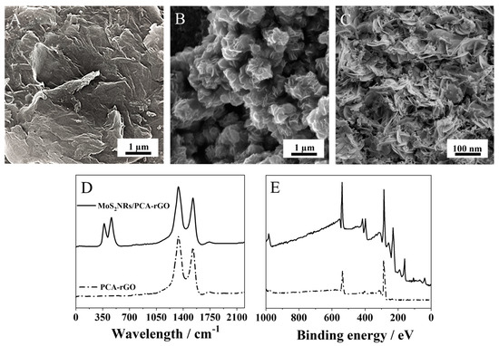 SEM images of (A) PCA-rGO/PGEs (21 KX) and (B,C) MoS2NRs/PCA-rGO/PGEs (28.5 KX (B), 220 KX (C)). (D) Raman and (E) XPS survey spectra of the PCA-rGO/PGEs (dash-dot line) and MoS2NRs/PCA-rGO/PGEs (solid line).