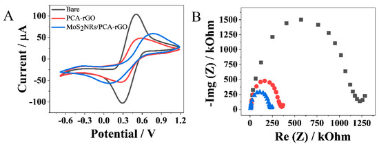 (A) CV scans at 50 mV s−1 and (B) EIS spectra of neat PGEs, PCA-rGO/PGEs, and MoS2NRs/PCA-rGO/PGEs, in 0.01 M PBS added with 0.1 M KCl and 5 mM Fe[(CN)6]3−/4− (pH 7.4).