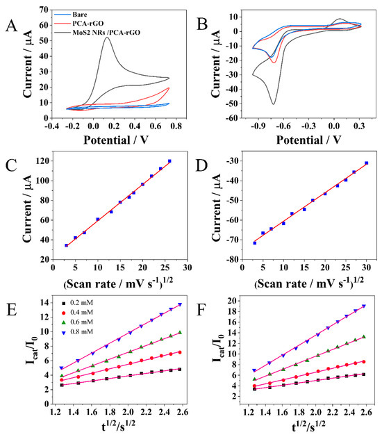 CVs collected at the PGEs, PCA-rGO/PGEs and MoS2NRs/PCA-rGO/PGEs, at 50 mV s−1, in 0.1 mM PBS buffer (7.4 pH), (A) 1 mM in N2H4 from −0.3 V to 0.7 V, and (B) 1 mM in 4-NP from −1 V to 0.3 V. Oxidation currents of N2H4 at 0.13 V (C,E) and reduction currents of 4-NP at −0.71 V (D,F) at the MoS2NRs/PCA-rGO/PGEs, between 100–500 mV s−1, versus square root of scan rate (C,D) and versus square root of time (E,F), in the 0.2 mM–0.8 mM range, in 0.1 M PBS buffer solutions (pH 7.4).