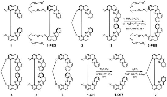 Syntheses of the molecules 1–6 considered in this study (Figure 1) have been reported elsewhere [20,22]. We showed that these two series of non-constrained (open) 8-/10-ring and constrained (closed) 9-/11-ring helically-shaped compounds can be obtained as pure enantiomers on a gram scale from a key chiral intermediate [23]. Recently, a water-soluble PEGylated (PEG = polyethylene glycol) derivative of 1, labelled in the following as 1-PEG, has been proposed [24]. Herein, we introduce its analogue, a water-soluble derivative of 3, 3-PEG. 1-PEG and 3-PEG were obtained in 69% and 53% yields, respectively, for (+)-1-PEG and (−)-1-PEG, or 69% and 67% for (+)-3-PEG and (−)-3-PEG, by successive demethoxylation of 1 or 3 using boron tribromide (BBr) and phenol nucleophilic substitution with 2,5,8,11,14-pentaoxahexadecan-16-yl 4-methylbenzene-1-sulfonate (Figure 1). We also present the synthesis of a new closed compound 7 bridged by a furan ring. It has been unexpectedly obtained for the first time as the only product in our attempts to synthesize a bis-boronate derivative of 1 by Miyaura borylation reaction using bis(diphenylphosphino)ferrocene dichloropalladium(II) (PdCl(dppf)) as a catalyst under basic conditions. Similarly, intramolecular O-arylation ring closure instead of cross-coupling of bis(pinacolato)diboron (Bpin) with bis-triflated precursors has already been reported, and the proposed pathway involves (i) partial hydrolysis of one of the triflates by a trace amount of water in the solvent and (ii) intramolecular aromatic nucleophilic substitution that leads to the formation of the oxygen bridge [25,26]. In an attempt to optimize the yield of 7 by varying the type of catalyst, PdCl(dppf) or Pd(PPh) and dicyclohexyl(2’-methyl-[1,1’-biphenyl]-2-yl)phosphine or Pd(dba) (dba = dibenzylideneacetone) and 9,9-dimethyl-4,5-bis(diphenylphosphino)xanthene (Xanphos), temperature, and reaction time, we ultimately found that the best results are obtained without a catalyst. Finally, (±)-1-OTf [24] is heated at 140 C for 5 days in the presence of two equivalents of KPO, yielding 30% of (±)-7 (Figure 1). Such conditions are not compatible with the synthesis of 7 as pure enantiomers due to possible racemisation of 1-OTf. Subsequently, the preparative resolution by chiral HPLC was performed (see the Supplementary Materials) and gave both enantiomers of 7 with an enantiomeric excess higher than 99.5%.
