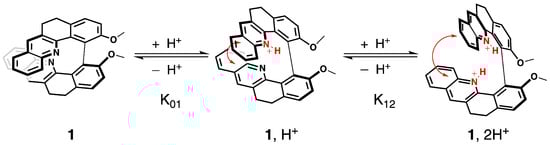 We have already evidenced that the spectroscopic properties of the molecules in the series of 1–6 are strongly affected by their electronic and conformational structure [20]. In this study, we postulate that protonation will modulate spectroscopic fingerprints in a similar way. Namely, after the binding of a proton to the pyridinic nitrogen atoms, the inductive attractor effect of the pyridinium will disturb the electronic distribution along the skeleton of the molecule, while repulsion between the bis-pyridinium positive charges is expected to change the helical pitch of the structure and thus the conformational preferences, as illustrated for 1 in Figure 3 (vide infra).
