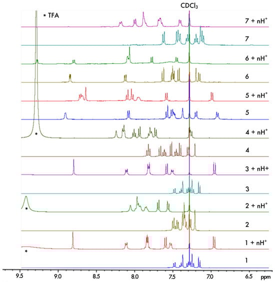 Comparison of the chemical shifts in the aromatic region of the H NMR spectra for 1–7 in CDCl and upon their protonation in CDCl with an excess of TFA (indicated by * in the spectra) ensuring n ≫ 2.