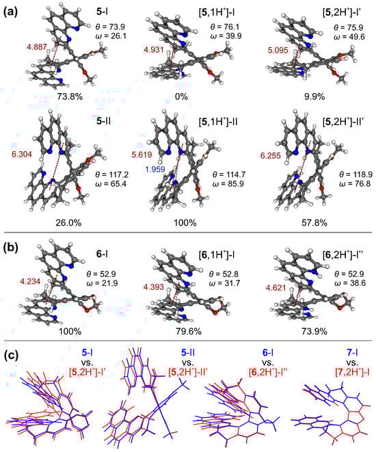 The lowest-energy optimized structures of the neutral [20], mono-, and double-protonated species of 5 (a) and 6 (b) in the ground state. Numbers listed are the Boltzmann populations at 298 K, distances (in Å) between the inner pyridine ring centroids of each 1,10-phenanthroline subunit (in red), biphenyl’s torsional angles, and angles between two aromatic subunits’ planes ( and , respectively, in , compared with Figure 2). The length (in Å) of the hydrogen bonding formed between two subunits in [5,1H]-II is also provided (in blue). (c) Overlays of the optimized structures of the most populated conformers of 5, 6, and 7 in their neutral (blue) and double-protonated (red) forms. BLYP/TZVP/COSMO(CHCN) calculations.