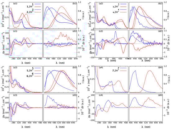 Absorption (a1–a4) and ECD (c1–c4) spectra, recorded in CHCN at a typical concentration of mol/L, along with fluorescence (b1–b4) and CPL (d1–d4), measured in CHCl at a typical concentration of 10 mol/L, for 1–7 (open: 1, 3, 5; closed: 2, 4, 6, 7) in their neutral and protonated forms. Blue solid and dash lines represent, respectively, open and closed structures in neutral medium, while red solid and dash lines correspond to open and closed structures in acidic medium. For clarity, only spectra for the (+)-enantiomers are presented. For the corresponding results for the (-)-enantiomers, see the Supplementary Materials. For detailed measurement conditions, see Section 4.