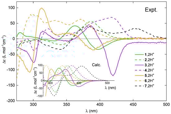 Comparison of the experimental ECD spectra for (+)-enantiomers of 1–7 upon their protonation. Inset: The corresponding TDDFT-simulated Boltzmann-averaged ECD spectra. No spectral shifts were applied. LC-PBE0*/SV(P)/PCM(CHCN) calculations.