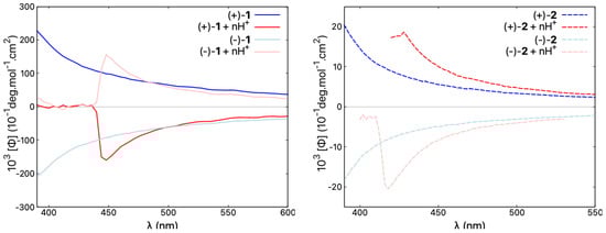 Comparison of ORD spectra for both enantiomers of 1 and 2, representative of open and closed compounds, respectively, recorded in CHCl and in CHCl with an excess of TFA ensuring n ≫ 2, at a typical concentration of mol/L. Blue/red lines correspond to neutral/acidic medium. See the Supplementary Materials for the corresponding ORD results for other molecules in the series.