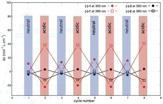 Reversibility of the protonation/deprotonation-triggered switching of the ECD signal at 350 and 390 nm for (-)-1 and (-)-2 (in CHCN, at c = mol/L and c = mol/L, respectively) after successive changes in the character (neutral/acidic) of the medium. Four cycles of acidification (using sulphuric acid)/basification (using sodium hydroxide) have been performed, i.e., eight ECD spectra have been measured. The corresponding full ECD spectra obtained upon the protonation/deprotonation cycles are presented in Figures S1.6–S1.7 in the Supplementary Materials.