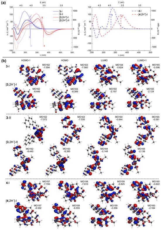 (a) TDDFT-simulated ECD spectra of 3 and 4 in their neutral [20] and double-protonated forms (Boltzmann-averaged spectra based on the most populated conformers (I and II) found are given in bright blue and red colors), along with selected excitation energies and rotatory strengths indicated as ’stick’ spectra. (b) Selected MOs (±0.04 au) involved in the corresponding lowest-energy excitations. Numbers listed are orbital energies in eV. LC-PBE0*/SV(P)/PCM(CHCN) calculations.