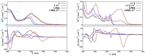 Comparison of absorption (top) and ECD spectra (bottom) of 1 and 1-PEG (left) and of 3 and 3-PEG (right). Measurements for 1 and 3 were performed in CHCN and CHCN/TFA, and for 1-PEG and 3-PEG in HO and HO/HCl. For clarity, only spectra for the (+)-enantiomers are presented. For detailed measurement conditions, see Section 4.