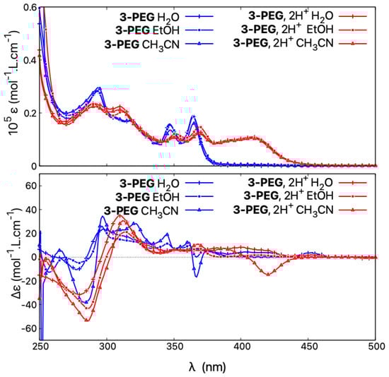 To further investigate why 1-PEG and 3-PEG do not follow the acid/base-triggered switching trend established for the other (non-pegylated) open systems 1, 3, and 5, and do not demonstrate an intense negative band at low energy for their protonated (+)-enantiomers, the spectra of 3-PEG were measured in various solvents under neutral and acidic conditions. As seen in Figure 13, the absorption properties show no solvatochromism and, regardless of the solvent employed in the study, the resulting spectra are superimposable in both neutral and acidic medium, the latter showing the typical protonation fingerprint. However, the solvent used visibly affects the ECD responses. Under neutral conditions, different spectra are obtained in water, ethanol, or acetonitrile. For example, the ECD signal at 367 nm demonstrates a value of +7 molL·cm in water, 0 molL·cm in ethanol, and −17 molL·cm in acetonitrile, the latter being similar to what was found for 3 in the same solvent. In acidic medium, the same behaviour can be observed, as, for example, the ECD intensity at 422 nm changes from weakly positive in water/HCl to four times more intense and with the opposite sign in acetonitrile/TFA. The ECD spectral fingerprint of open 3 in its protonated state is thus restored if the spectra of 3-PEG are recorded in acetonitrile.