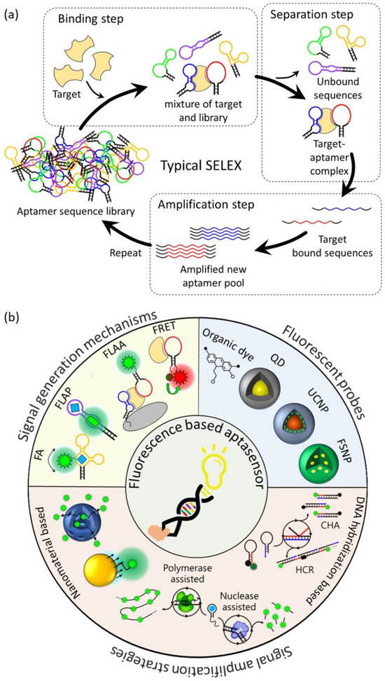 Schematic illustration of (a) a typical SELEX protocol for aptamer selection, (b) aptamer-based fluorescent biosensors for biological application.