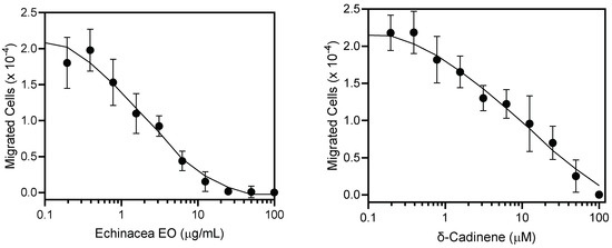 A growing body of research suggests that E. purpurea has immunostimulatory properties. For example, the E. purpurea root extract was reported to have immune-enhancing properties by lowering the frequency and function of regulatory T cells [65]. In another study, oral administration of an E. purpurea extract increased natural killer cell activity in mice by increasing the levels of MHC II, CD4 T cells, and Th1 cytokines [66]. Likewise, an ethanolic extract of the aerial parts was reported to modulate cytokine response in human T-cells [67]. We hypothesized that the E. purpurea EO could have innate immunomodulatory properties. In the present study, human neutrophils were used to evaluate the innate immunomodulatory effects of the E. purpurea EO and their major components. Neutrophils are immune cells that serve as both effectors and regulators in the development of the innate inflammatory response [68]. As shown in Table 4, the treatment of human neutrophils with the E. purpurea EO induced intracellular Ca2+ mobilization (EC50 = 19.9 ± 4.5 μg/mL). This is an important finding, as intracellular Ca2+ mobilization plays an important role in neutrophil activation and function [69,70]. As shown in Table 4, the E. purpurea EO components (+)-δ-cadinene and α-phellandrene also induced comparable changes in intracellular Ca2+ concentrations ([Ca2+]i) in neutrophils compared to that observed previously with germacrene D [71] with EC50 values between 20.8 and 24.6 μM. In contrast, no activity was observed for β-caryophyllene. Previously, we found that EOs and their components could inhibit neutrophil migration [71,72,73]. Thus, we analyzed the effects of the E. purpurea EO and (+)-δ-cadinene on neutrophil chemotaxis and found that pretreatment with the E. purpurea EO (IC50 = 1.8 ± 0.6 μg/mL) or (+)-δ-cadinene (IC50 = 0.48 ± 0.1 μM) for 10 min suppressed fMLF-induced human neutrophil chemotaxis in a dose-dependent manner (Table 4, Figure 2).