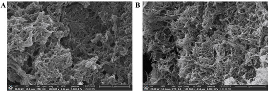The SEM images of TpDMB-COPs-MMM (A) and TpDMB-COPs powder (B) (Magnification: 100,000×).