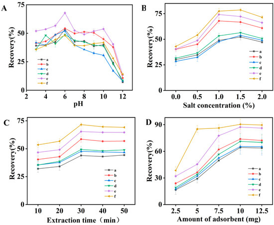 The investigation of sample pH (A); salt concentration (B); amount of adsorbent (C), and extraction time (D) (a: SMR, b: SMP, c: SMX, d: SDX, e: SDM, and f: SQ).