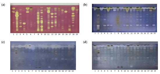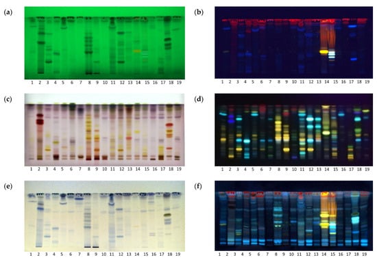 Aromatic compounds and conjugated systems were seen as dark zones against a green background under 254 nm as they absorb UV light and quench the green fluorescence of the plate fluorescent indicator (Figure 1a), while red-, yellow- and blue-colored fluorescent zones were seen under UV 366 nm (Figure 1b), as the fluorescence of some substances was excited by long-wave UV light. For those compounds which were not visible under UV light, plates were exposed to chemical reagents. The vanillin–sulfuric acid (VSA) reagent was used as a reagent for higher alcohols, phenols, steroids and terpenoids [12]. VSA produced a range of colors, depending on the types of compounds, although the color and intensity of the observed zone also depends on the concentration of the compound separated on the plate. Proanthocyanidins (oligomeric flavonoids) are seen as bright pink [13], monoterpenes and steroids as bright yellow to violet zones, while flavonoids are colored yellow [14]. Thus, red and pink colors suggest the presence of phenolic derivatives and a rich content of proanthocyanidins in green tea, walnut, St. John’s wort and immortelle (Figure 1c, Tracks 2, 8, 9 and 18), while violet color suggest the presence of various terpenoid derivatives at the upper parts of most chromatograms (RF = 0.8–0.9).