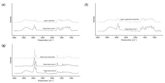 ATR-FTIR spectra of compounds eluted from different zones (black lines) and reference standards (dashed lines). (a) Theae folium zone 2 and EGCG; (b) Theae folium zone 3, L-theanine and piperidinol derivative (4-But-3-en-1-ynyl-1,2,5-trimethylpiperidin-4-ol); (c) Theae folium zone 4 and L-glutamic acid; (d) Theae folium zone 5 and caffeine; (e) zone 6 and lignin, hydrolytic; (f) Theae folium zone 7 and organosolv, lignin, propionate; (g) Theae folium zone 8, Theae folium zone 9 and a long-chain fatty acid ester (stearic acid, ethyl ester).