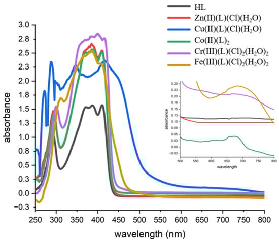 | Zn(II)(L)(Cl)(H2O) | 295, 380, 430 | Diamagnetic | Tetrahedral | d10 |