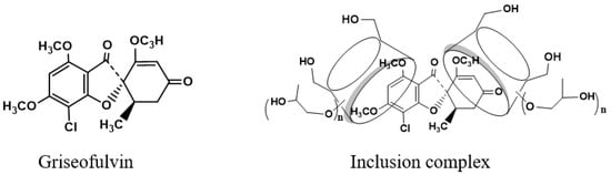Since 1988, cyclodextrins have been used to form the complex with griseofulvin to increase griseofulvin’s water solubility. It was reported that when α-cyclodextrin, β-cyclodextrin, dimethyl-β-cyclodextrin, and γ-cyclodextrin were formed in complexes with griseofulvin by using kneading, spray, physical mixing, or precipitation methods, γ-cyclodextrin was found to give the best result for an increase in water solubility [12,13,14,15,16]; the solubility, dissolution rate, and bioavailability of griseofulvin in complex were affected by the complexation temperature, surfactants, and the ratio of cyclodextrin and the drug [17,18,19,20]. It was reported that during the formation of the complex, HP-β-cyclodextrin could effectively inhibit the particle growth and stabilize the suspensions; in total, 72% of the griseofulvin was precipitated, while the rest of the griseofulvin formed the inclusion complex. The mixture showed improvements in the release rate and water solubility by 9.9 and 11.5 times, respectively [21,22,23]. When the solution of griseofulvin in the mixture of acetone and ethanol was treated with β-cyclodextrin, griseofulvin submicron particles from 600 to 900 nm were obtained and showed marked improvement in dissolution velocity [5].