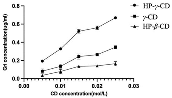 The UV spectroscopy of the solution of griseofulvin in the mixture of water and ethanol was recorded to obtain griseofulvin’s maximum UV absorption wavelength (292 nm) for its HPLC analysis. Through the phase solubility studies of griseofulvin in the water solutions of HP-β-cyclodextrin, γ-cyclodextrin, and HP-γ-cyclodextrin with different concentrations, it was found that when the concentration of HP-γ-cyclodextrin was increased and the solubility of griseofulvin was improved the most. The phase solubility curves were classified as AL types (Figure 2) according to the description from Higuchi and Connors [36].