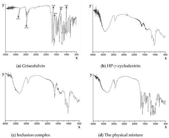 Compared with the inclusion complex, the peak shapes of HP-γ-cyclodextrin were unchanged, indicating the structure of HP-γ-cyclodextrin in the inclusion complex was unchanged (Figure 3b,c). However, the shapes, positions, and intensity of the peaks corresponding to griseofulvin in the inclusion complex were obviously changed compared with that of griseofulvin, which confirmed the formation of the complex of griseofulvin with HP-γ-cyclodextrin, while the infrared spectrum of the physical mixture was just the superposition of the spectra of griseofulvin and HP-γ-cyclodextrin (Figure 3d).