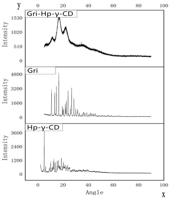 As shown in Figure 5, the X-ray diffraction patterns of griseofulvin and HP-γ-cyclodextrin with sharp peaks indicate they are different crystalline compounds; however, the X-ray diffraction pattern of the inclusion complex does not show the characteristic peaks of HP-γ-cyclodextrin and griseofulvin completely, which indicates that the product did not contain pure griseofulvin and pure HP-γ-cyclodextrin.