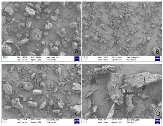 Scanning electron microscopy was used to study the changes in the surface morphology of griseofulvin and its inclusion complex, and their micrographs are shown in Figure 6. When the sample was magnified to 20 μm, the sample of HP-γ-cyclodextrin appeared as an uneven block shape (Figure 6A), the sample of griseofulvin appeared as an amorphous shape (Figure 6B), and in their physical mixture, griseofulvin was distributed around the HP-γ-cyclodextrin (Figure 6C), while the inclusion complex presented an irregular fragment shape (Figure 6D). The difference between the micrographs of griseofulvin and its complex with HP-γ-cyclodextrin confirmed the formation of the inclusion complex directly.