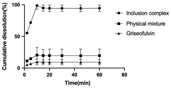 The dissolution rates of griseofulvin, the physical mixture of griseofulvin and HP-γ-cyclodextrin, and their inclusion complex in degassed water with a pH of 7 were examined and are shown in Figure 7. After 10 min, the cumulative dissolution of griseofulvin in water was only near 2%, the cumulative dissolution of the physical mixture of griseofulvin and HP-γ-cyclodextrin was about 18%, while the cumulative dissolution of the inclusion complex of griseofulvin with HP-γ-cyclodextrin was more than 90%, which was much better than that of griseofulvin alone.