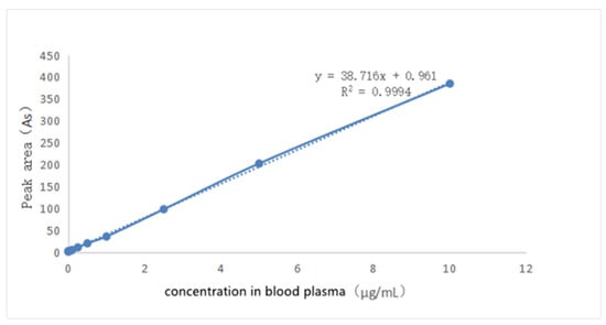 The solutions of griseofulvin in the mobile phase (50 µL) with different concentrations from 0.5, 1, 2.5, 5, 10, 25, 50 to 100 µg/mL were added to 450 µL of the canine blank plasma in a centrifuge tube. After vortexing in a vortexer for 4 min, each sample was analyzed by HPLC, and based on the peak areas and concentrations, the standard curve of griseofulvin in dog plasma was obtained.