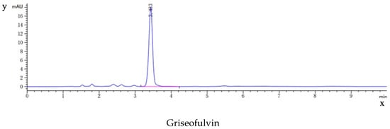 A series of griseofulvin solutions from 500 μg/mL to 1 μg/mL diluted from the solution of griseofulvin (5 mg) in acetonitrile (2 mL) were analyzed on HPLC with 20 μL of injection volume to obtain the linear regression equation as Y = 23,582X + 22.861 (coefficient of determination: R2 = 0.9999, Y: peak area, X: concentrations from 8 μg/mL to 500 μg/mL). The LLOD was 0.01 μg/mL, and LLOQ was 0.05 μg/mL, the running time for each sample was 10 min, and the concentration of the fresh prepared solution for curve calibration is 0.01 μg/mL.