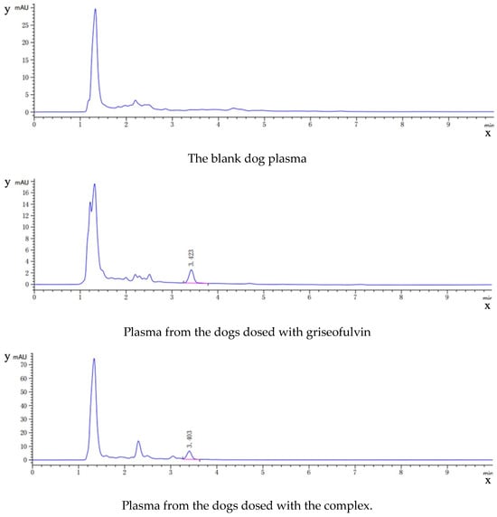 As shown in Figure 9, the HPLC analysis of griseofulvin, the blank dog plasma, the plasma from the dogs dosed with griseofulvin, and the plasma from the dogs dosed with the griseofulvin/HP-γ-cyclodextrin inclusion complex indicated that the blank dog plasma did not interfere with the detection of griseofulvin.