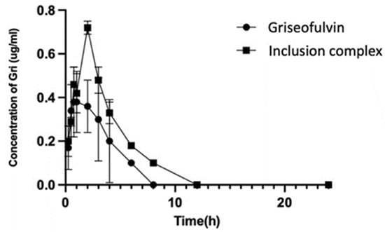 The in vivo pharmacokinetic study of the complex in dogs was conducted, griseofulvin and its HP-γ-cyclodextrin inclusion complex were orally dosed to dogs in two groups (six for each group) at a single dose of 15 mg/kg, the blood samples were collected at 0, 0.25, 0.5, 0.75, 1, 2, 3, 4, 6, 8, 12, 24, 36, 48, and 72 h immediately after drug administration, respectively.