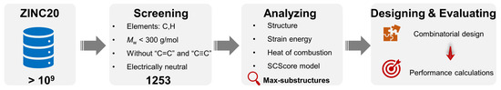 Herein, as depicted in Figure 1, high-throughput screening is employed to obtain the molecules with potential as HEDH fuels from the ZINC20 database, and the structural features are mined by a statistical analysis as well as the maximum substructure search approach to improve the domain knowledge. More importantly, the topologically assembled schemes of syntin and QC using the common substructures of the above-screened candidates are excavated and combined with the combinatorial design strategy to further guide the design of 20 fuels. Ultimately, these designed fuels are evaluated with group-contribution methods and DFT calculations, all exhibiting higher volumetric net heat values of combustion than QC, illustrating the potential applications for HEDH fuels and the effectiveness of the proposed approach.