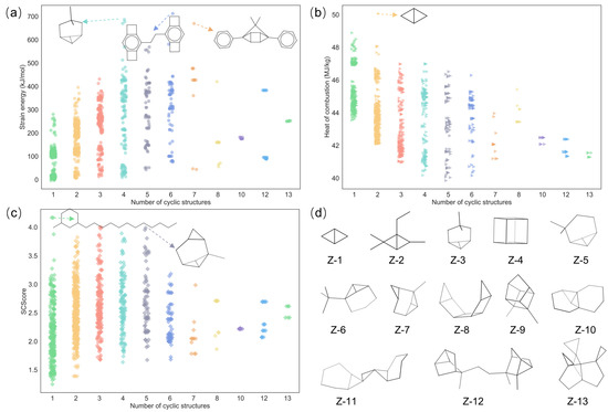(a) Strain energy distribution, (b) heat of combustion distribution, (c) SCScore distribution among molecules containing different numbers of cyclic structures; (d) structures of selected molecules. The colors are consistent with the molecular classes in Figure 2a.