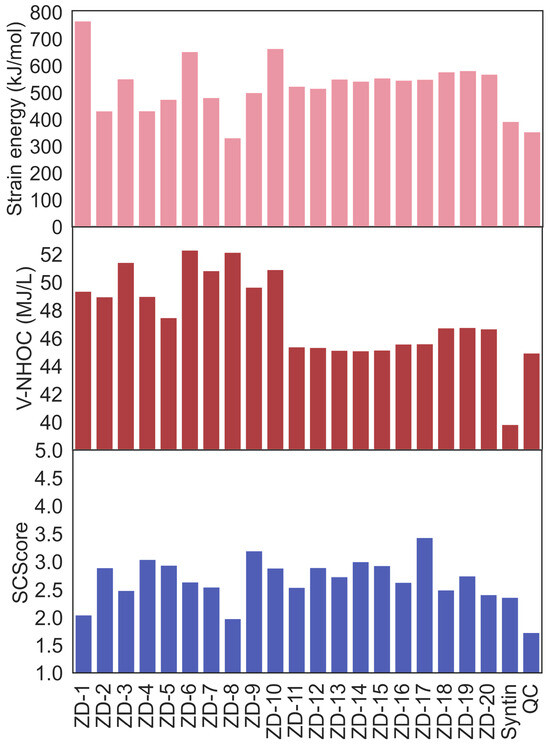 Furthermore, Figure 5 manifests the value of the strain energy, volumetric net heat of combustion (V-NHOC), and SCScore of the designed fuels after the calculations of the group-contribution methods and DFT. The great majority of the designed fuels possessed higher strain energies than the QC and syntin, which could be ascribed to the more strained three-membered cyclic and fused stereoscopic structures in the molecules. It is worth mentioning that ZD-1 was constructed by ZM-1 and two ZM-2 structured through the QC-assembled scheme. In other words, ZD-1 had a cage-like structure fused by the four three-membered cyclic structures, thus endowing it with a strain energy exceeding 700 kJ/mol. Moreover, Table 1 lists the estimated properties after the DFT calculations and Glushko’s formula, including the density, net heat of combustion (NHOC), melting point (Tm), flash point (FP), and Isp. The designed fuels from ZD-1 to ZD-10 with the QC-assembled scheme had a higher density than the other fuels generated with the syntin-assembled scheme, which could be attributed to the additional fused structures in the structure generation [37]. Meanwhile, since V-NHOC was equal to the density multiplied by the NHOC, the higher density and NHOC endowed a decent V-NHOC value, as shown in Figure 5, where the V-NHOCs of the design fuels were higher than that of the QC, showing the effectiveness of the design strategy for HEDH fuels. Considering the application in liquid fuels, the designed fuels (including ZD-8 and ZD-11 to ZD-17) with Tm higher than 273.15 K were not suitable [25]. Moreover, the FP value of designed fuels representing the lowest temperature at which the vapor of fuels ignites while in contact with a flame would be better at temperatures higher than 38 °C [40], and several designed fuels met this requirement. Further taking the values of specific impulses and synthetic complexities into account, ZD-6 stood out due to the Isp with a value of 358.5 s and an acceptable SCScore value of 2.64, showing the potential for its application as an HEDH fuel.