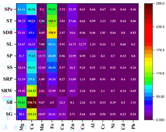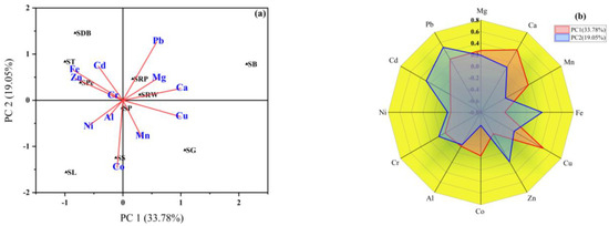 The metals, including Mg, Ca, Mn, Cu and Pb, illustrated significant positive loading values ≥ 0.14 in PC1, accounting for 33.78% of the total variance. Besides that, in PC1, samples SG, SB, SRW, and SRP had the greater score values. Conversely, PC2 explained 19.05% of the total variation in terms of metals such as Mg, Ca, Fe, Zn, Cr, Cd, and Pb with positive loading values greater than 0.03. The samples SDB, ST, SPe, SRP, and SB were found to have greater score values in PC2 (Figure 2a). The PCA suggests that the metals Ca, Mn, Cu, and Pb in PC1 showed the higher loadings, while on the other hand, in PC2, Ca, Fe, Zn, Cr, Cd, and Pb had higher loadings, as shown in Figure 2b and Table S2, Supplementary Materials. Figure 2b summarizes the loading of Ca, Fe, Zn, Cr, Cd, and Pb among the Ems and PTMs under investigation in PC2, which make up 19.05% of the total variance.